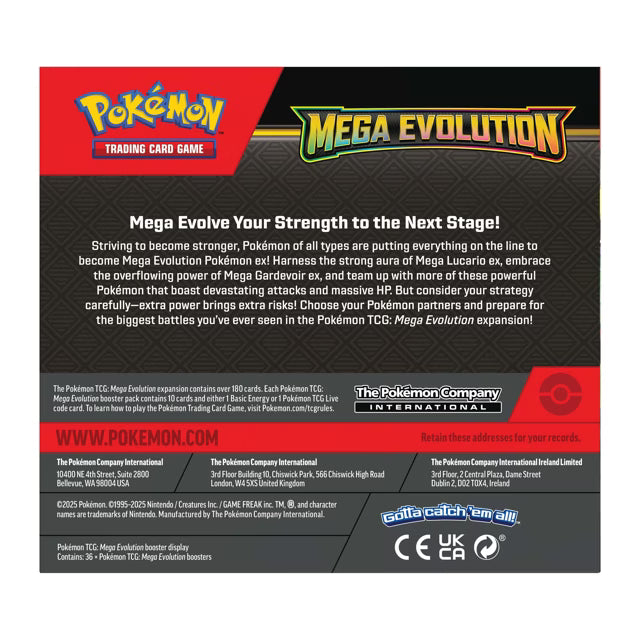 Each Pokemon TCG: Mega Evolution Booster Display includes 36 Booster Packs. Each Booster Pack includes 10 cards.